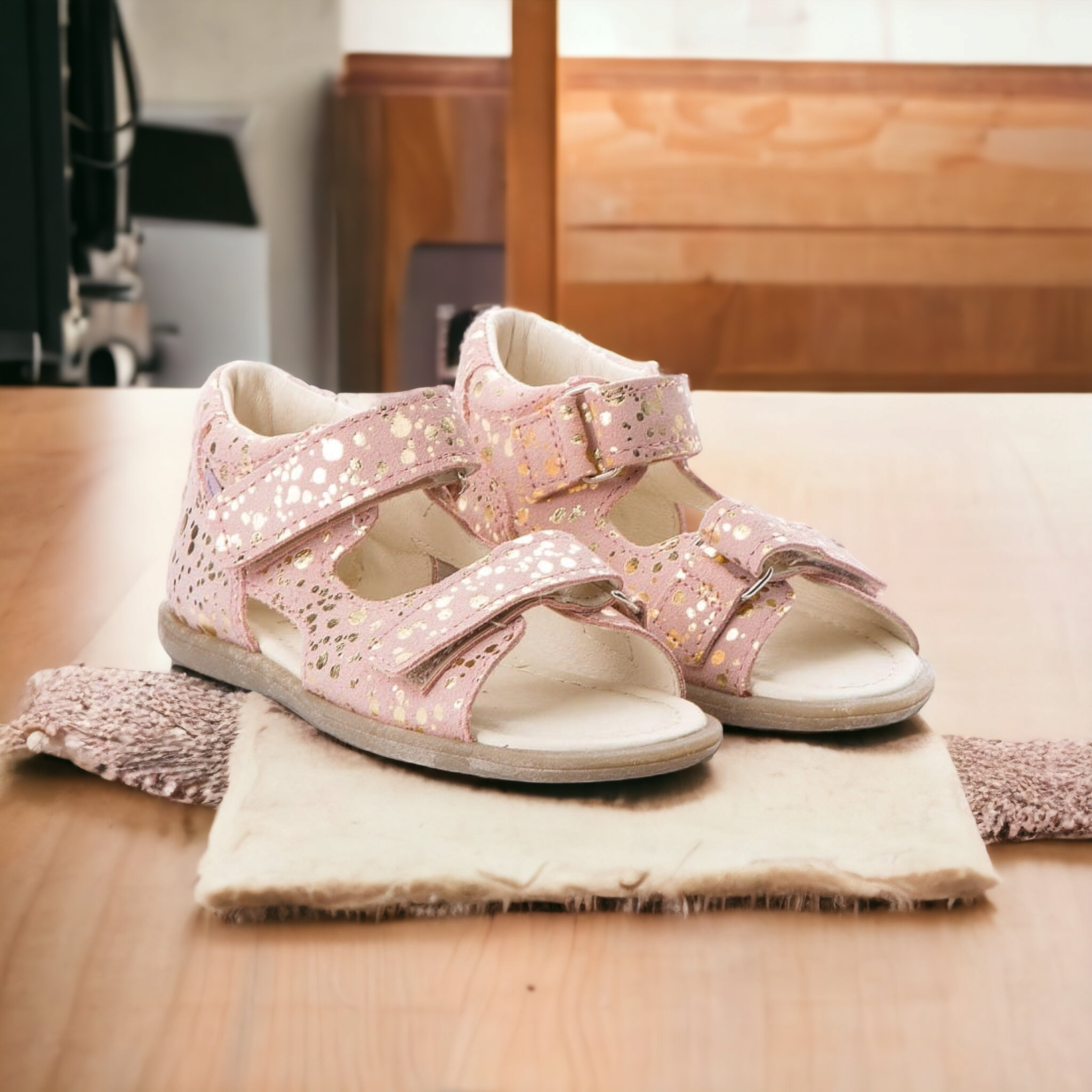 Wierzch: skóra welurowa w kolorze różowym ze złotymi plamkami