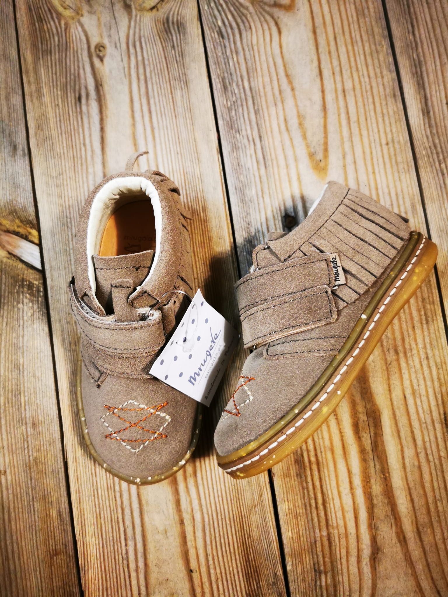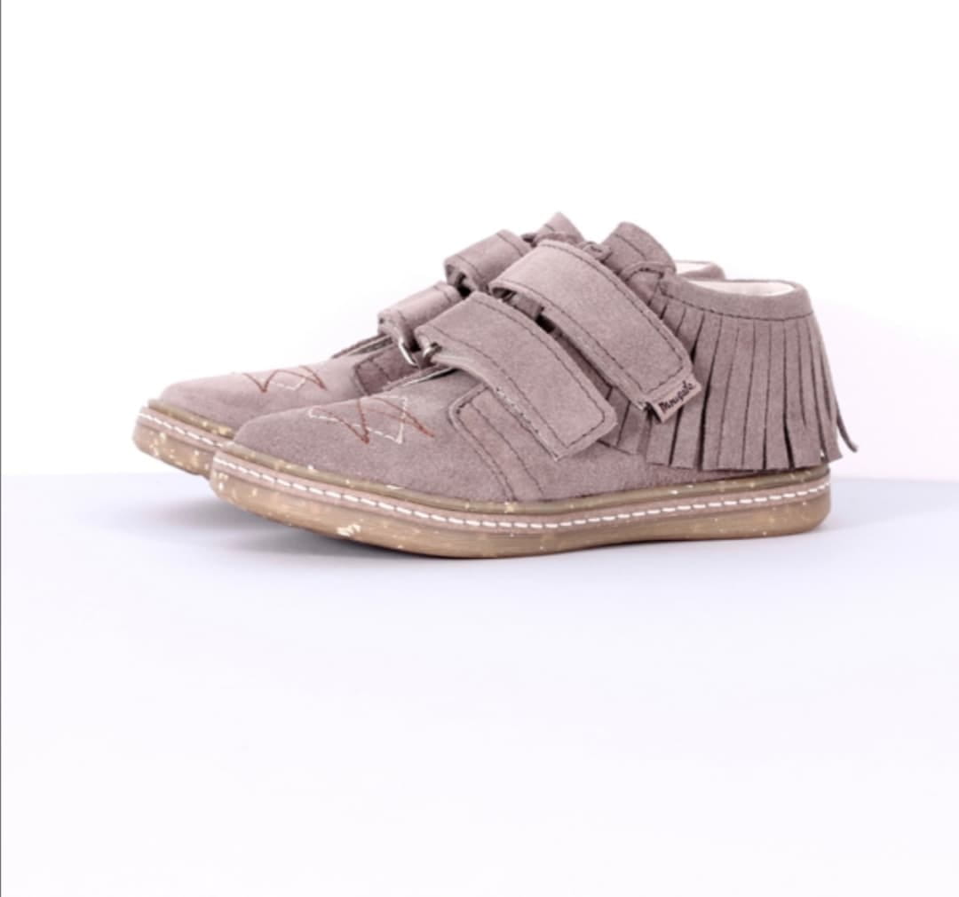 Fantastyczne trzewiki z frędzlami firmy Mrugała. Buciki są na rzepy z frędzlami z tyłu mają wyprofilowana wkładkę i usztywniona zapiętek co pozwala prawidłowo się rozwijać stopką.
